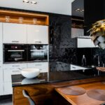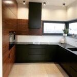 Kuchnia Dado fronty lakier połysk, dodatki fornirowane orzech amerykański, blat czarny połysk.